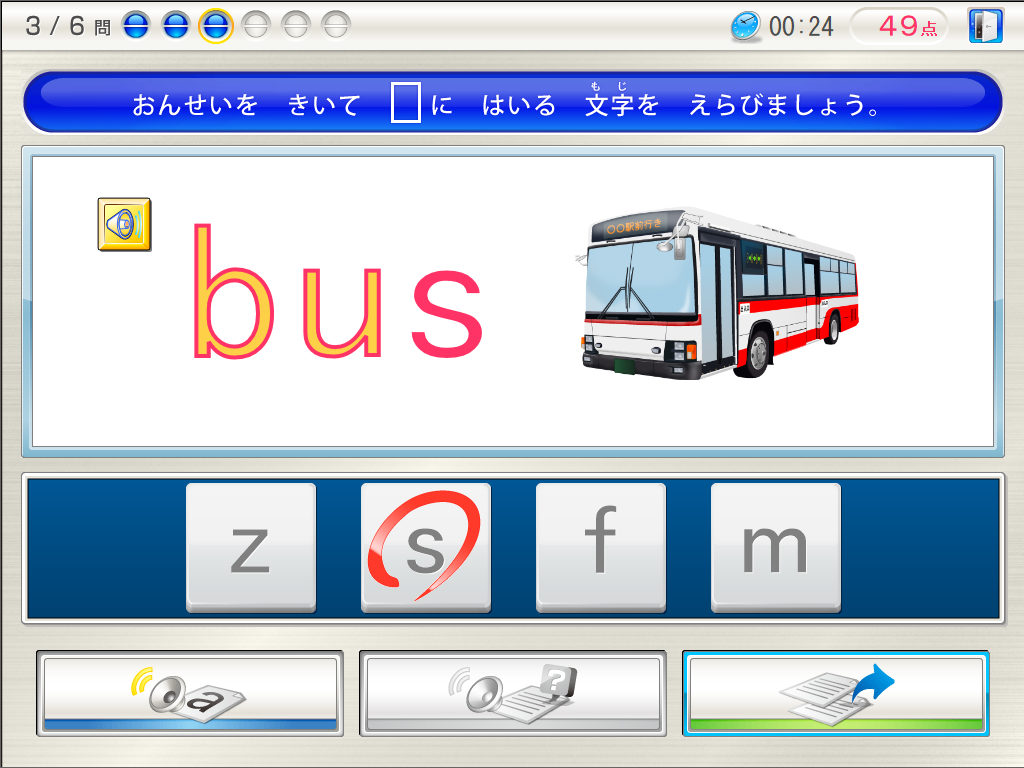 ミニゲーム風の問題で楽しく英語を学び、自然とアルファベット、単語、発音などをマスターした後は、英語を「聴く」耳を育て、「読む」脳を育て、「書く」ことができるように、段階を踏んで学習できます。